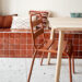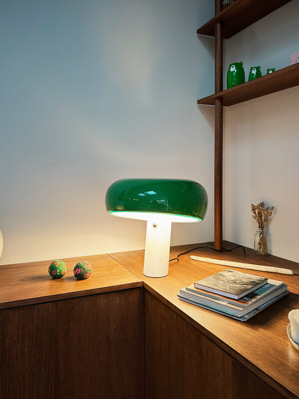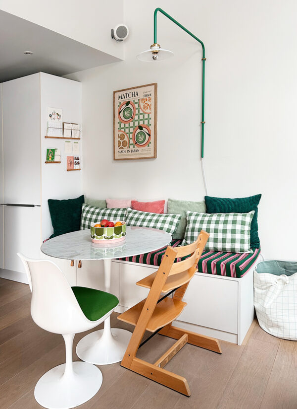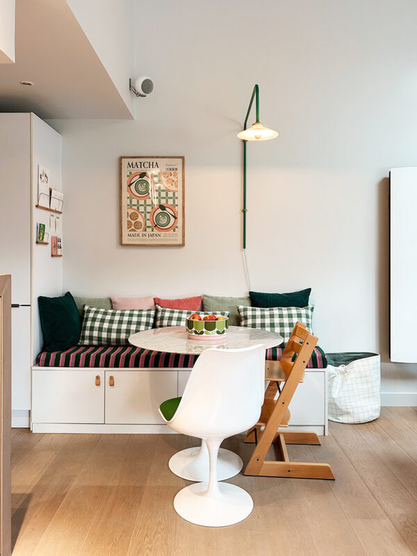 Le nouveau coin repas est vite devenu l’endroit préféré de leur fille et l’espace idéal pour leurs déjeuners. C’est devenu le point central, confortable et lumineux, éclairé par la lampe potence de Valerie Objects.
