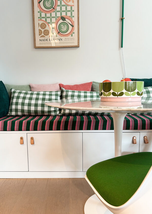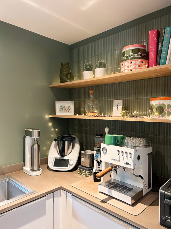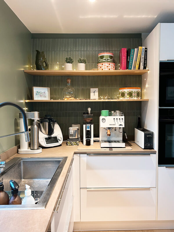 Pour finir, la salle à manger profite elle aussi de l’ajout de couleur. Sans être totalement transformée, elle gagne en dynamisme et en profondeur, car le regard est naturellement attiré vers le fond de la pièce. La cuisine également en vert Pic Nic avec sa crédence assortie, crée un joli lien visuel entre les 2 espaces.