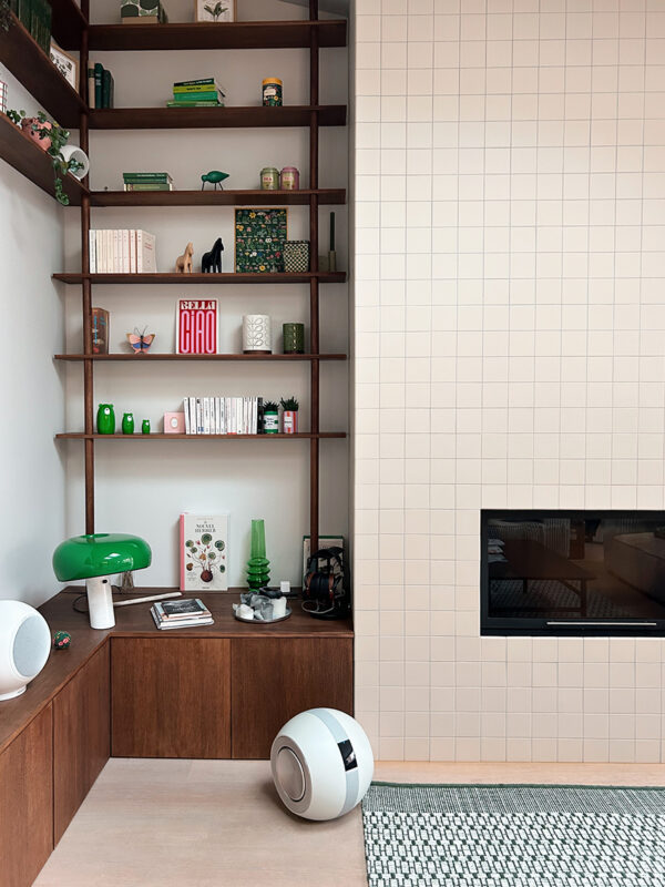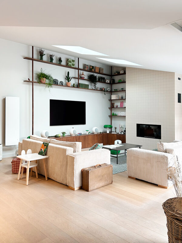 Et maintenant, place au résultat : la bibliothèque attire immédiatement le regard vers la hauteur sous plafond, la cheminée devient un vrai atout visuel, et le salon gagne en douceur grâce aux canapés en velours côtelé et au tapis en laine et coton vert.