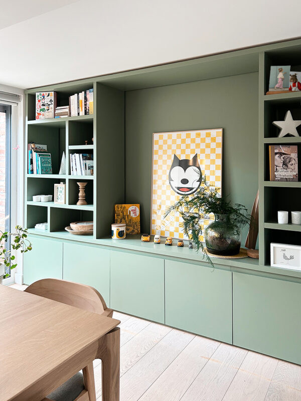 – Enfin, la bibliothèque de la salle à manger allait être repeinte avec le même vert en écho avec la cuisine et de créer un prolongement naturel avec le jardin.