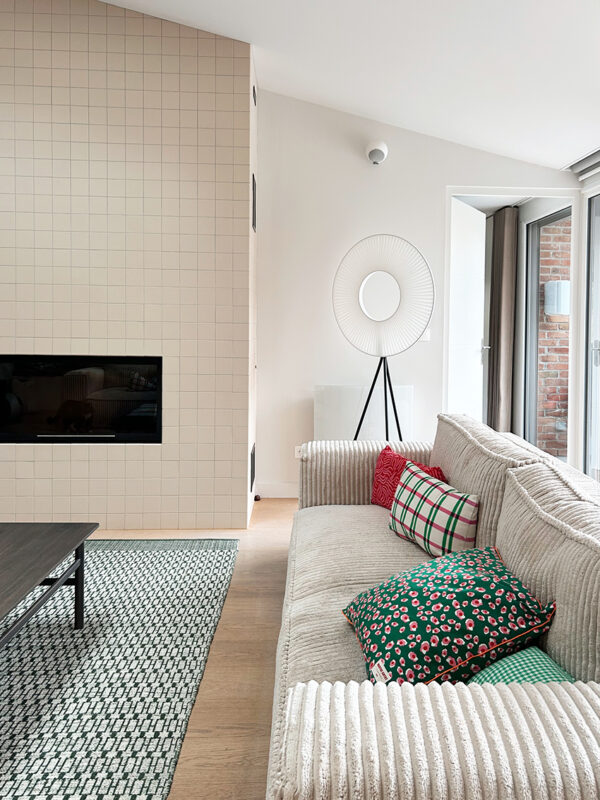 – Pour donner plus de style à la cheminée, assez sobre à l’origine, j’ai recommandé de la carreler pour mettre en valeur sa forme moderne et la rendre unique.