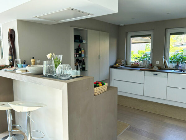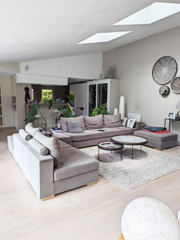 Relooker une maison d’architecte des années 80 pour lui redonner du caractère, c’est la mission que m’ont confiée mes clients Villeneuvois. Dès la première visite (réalisée entre le compromis et la vente) deux points les dérangeaient : le grand mur de trois mètres de haut dont ils ne savaient que faire. Et il y avait également une immense cave à vin posée sur la dalle brut située entre la cuisine et le salon en parquet, Ils la trouvaient trop imposante, inutile pour leurs besoins… mais que faire du sol en béton ?