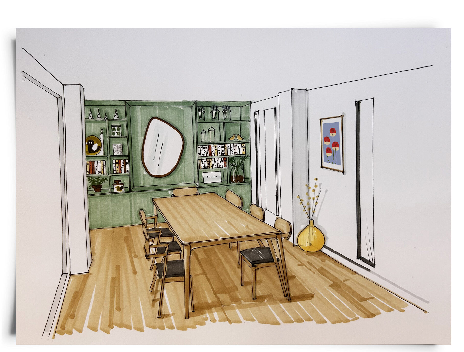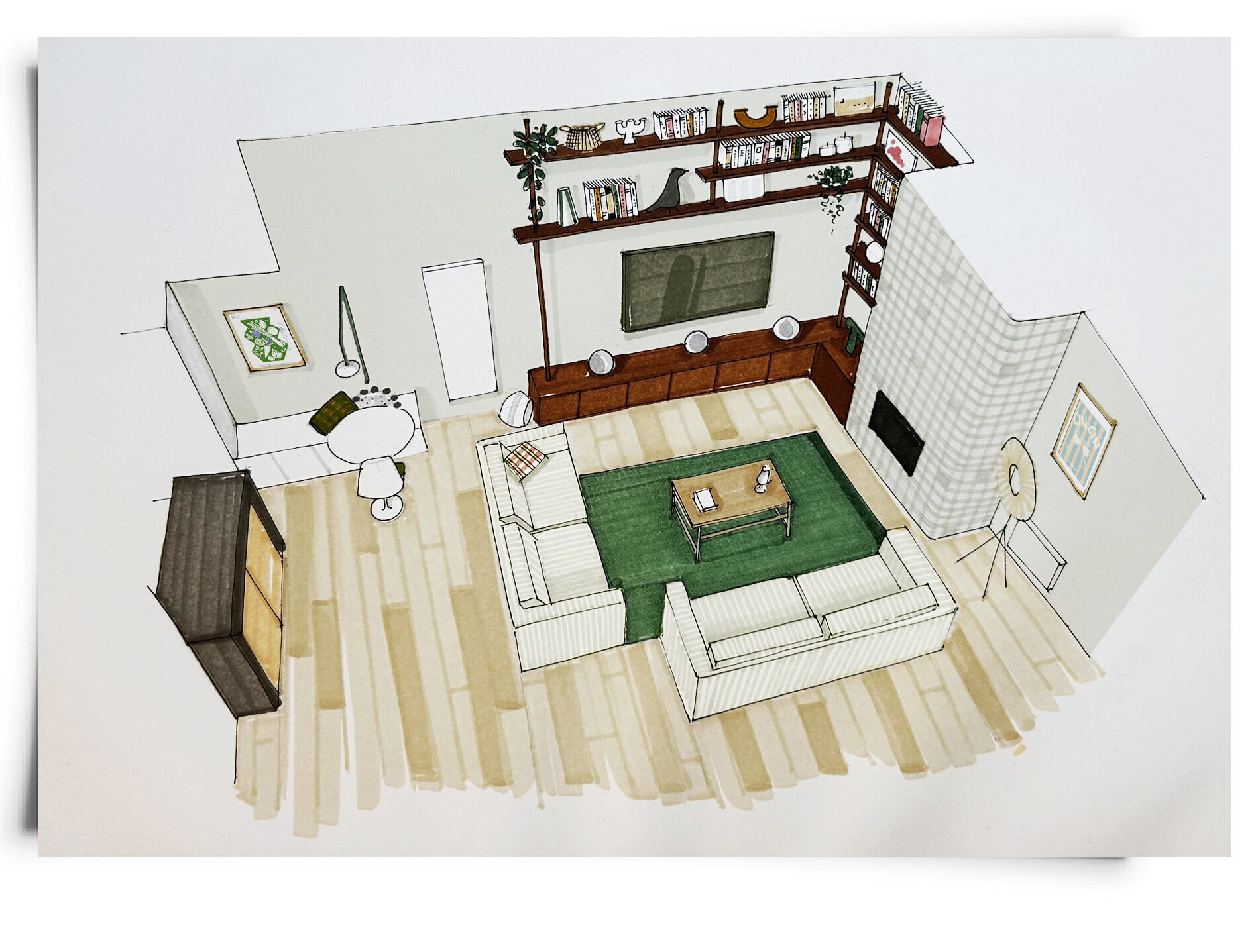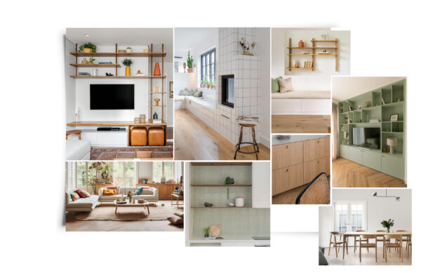 Le moodboard était accompagné de 2 croquis pour visualiser l’aménagement, valider le projet de bibliothèque sur mesure, le style et le shopping. On approche de la révélation ;-)