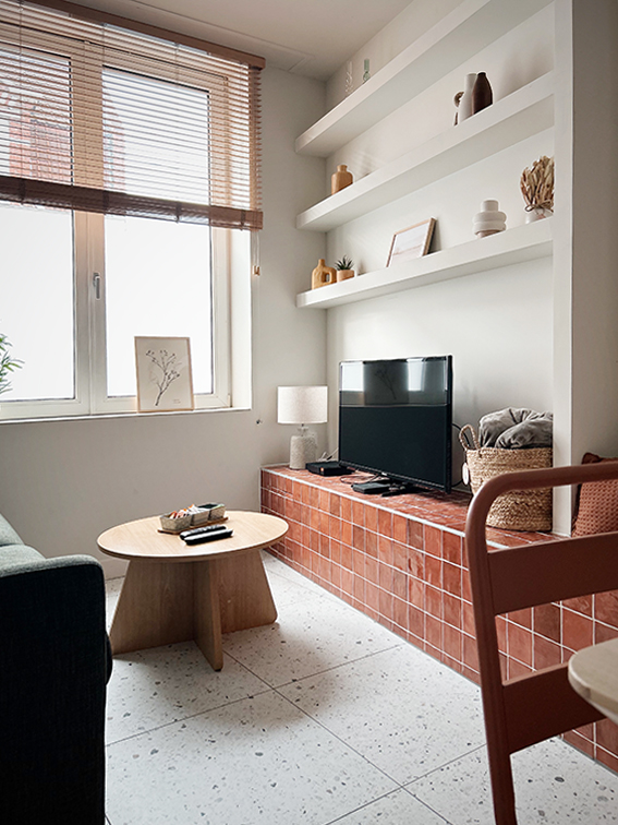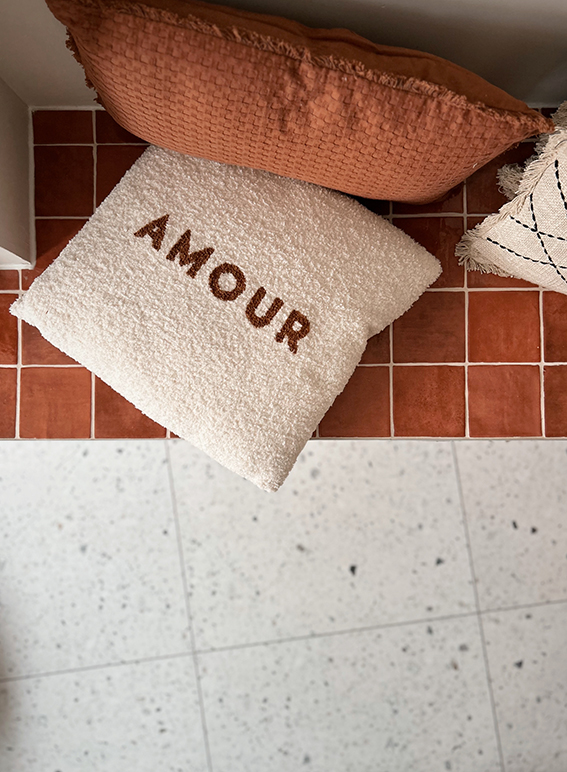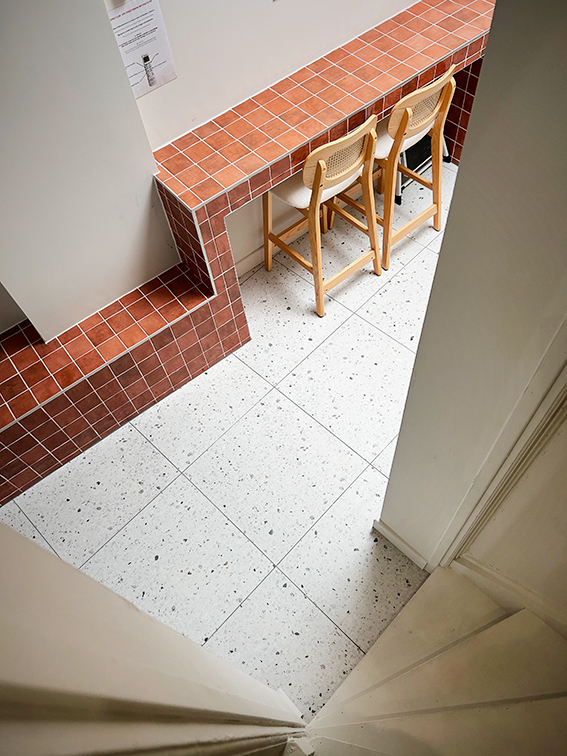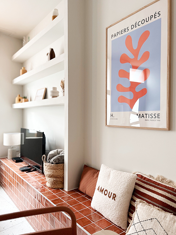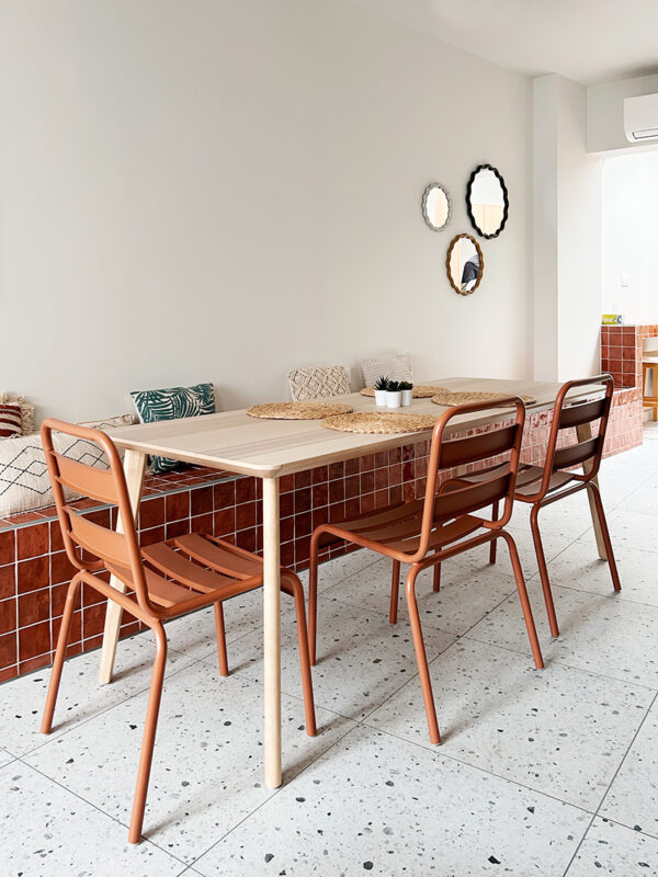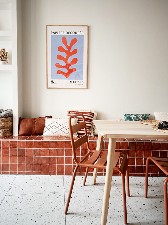 Il est temps de vous montrer le résultat en images ! Et bien sûr, je vous glisse quelques références qui pourront vous inspirer si, vous aussi, vous rêvez d’un intérieur à l’esprit Riviera. Le banc, d’une hauteur de 45 cm (comme une chaise), a été recouvert de carreaux effet zellige terracotta trouvés chez Leroy Merlin. Les murs, eux, sont peints en Blanc Champigny CH2 0023 de La Seigneurie, une teinte douce et lumineuse qui met en valeur les matériaux naturels. Enfin, le sol en terrazzo apporte la touche graphique et minérale qui lie l’ensemble avec élégance. (petite précision au passage : les luminaires arrivent, ils n’étaient pas encore livrés quand je suis venue prendre les photos)