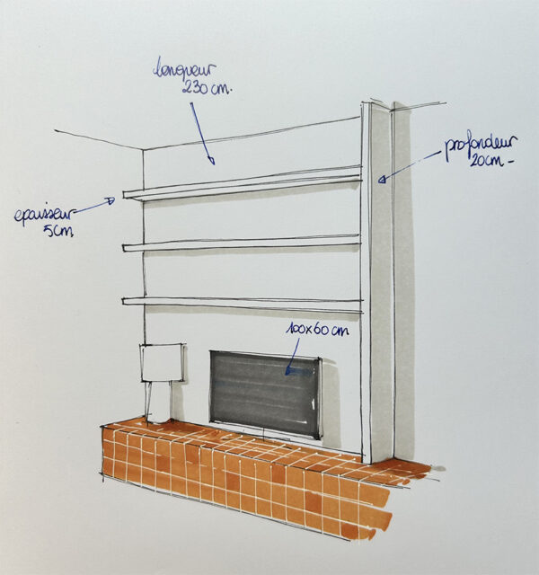 Ces croquis permettent à mon client de visualiser les volumes et les circulations. Je lui ai également proposé une alternative plus simple à mettre en œuvre pour les étagères situées au-dessus de la TV plutôt de conserver l’ancien conduit de cheminée.