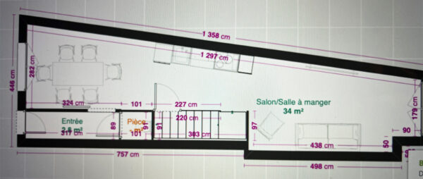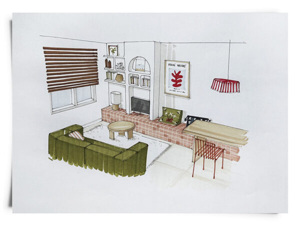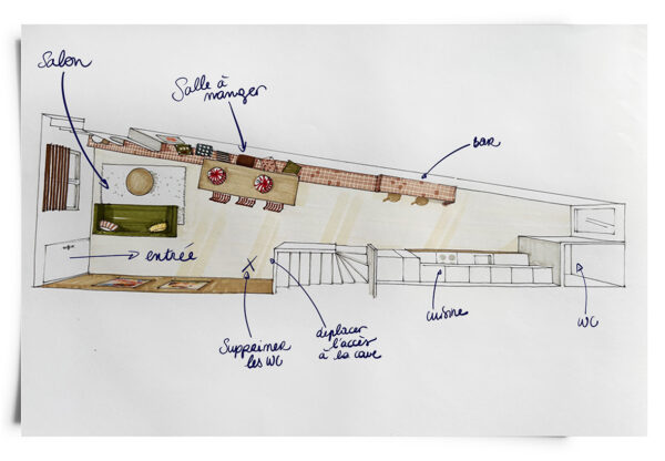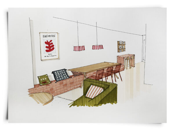 Passons aux dessins réalisés à la main pour donner vie au projet et en révéler toute la personnalité. Pour cette pièce à vivre, je me suis concentrée sur l’aménagement du salon et de la salle à manger, afin d’optimiser chaque mètre carré et d’offrir une belle fluidité entre les deux zones.