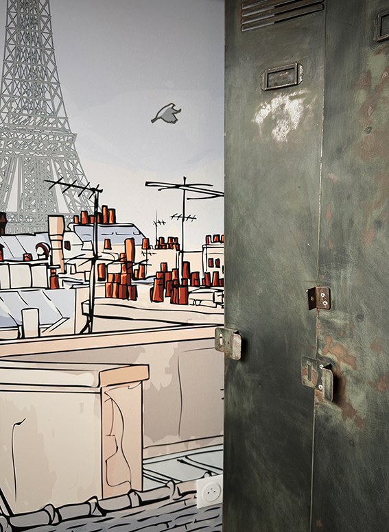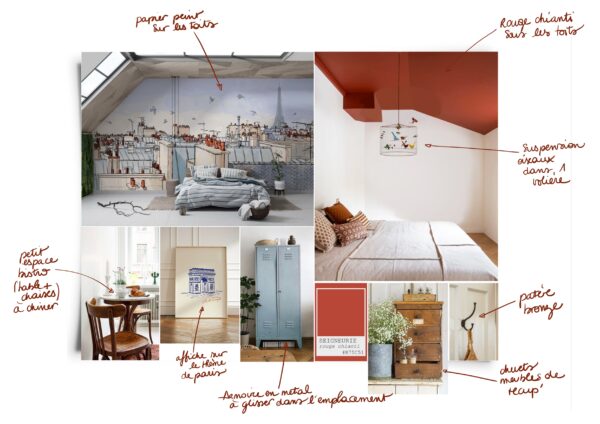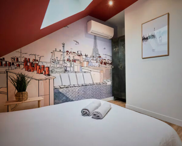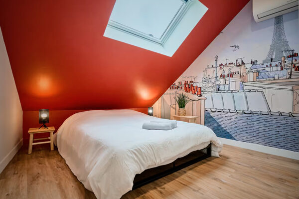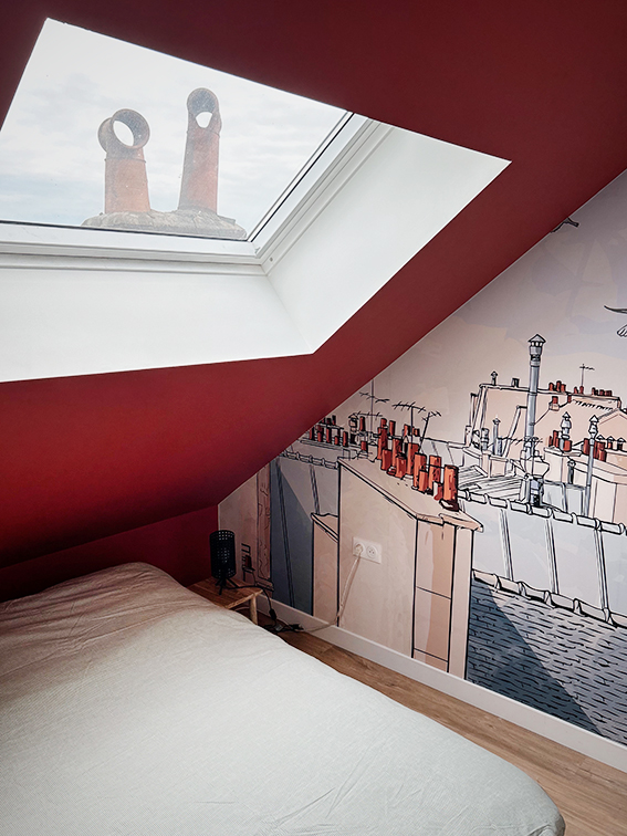 Pour la dernière chambre, nous montons d’un étage et arrivons directement sous les toits, au sens propre comme au figuré. C’est justement cette expression, “sous les toits”, qui m’a inspiré le thème : “Sous les toits de Paris”. Cette chambre est très mansardée, et j’ai voulu accentuer cet effet en peignant toute la pente dans un rouge éclatant, afin de renforcer cette sensation d’espace niché juste sous le toit. J’ai également proposé l’ajout d’un panoramique illustré et de quelques meubles chinés, pour rappeler le charme des petites chambres de bonne parisiennes. C’est un choix audacieux, je vous l’accorde, mais après tout, c’était la demande de mon client ?