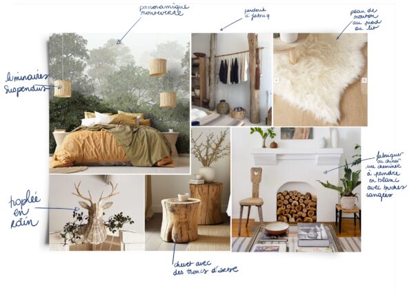 Passons à côté : la chambre dans les arbres. J’ai voulu inspirer mon client avec une ambiance très nature, presque immersive, grâce à un panoramique forestier. Des troncs d’arbres font office de chevets, et des luminaires suspendus apportent une lumière douce et tamisée. Pour renforcer encore cette atmosphère chaleureuse, le dressing a été imaginé à partir de branches de bouleau, et j’ai proposé d’ajouter une cheminée factice. Il ne manque plus que la bande sonore avec le bruit des feuilles !