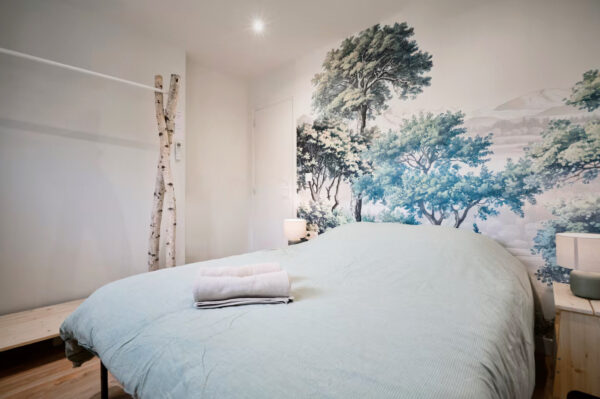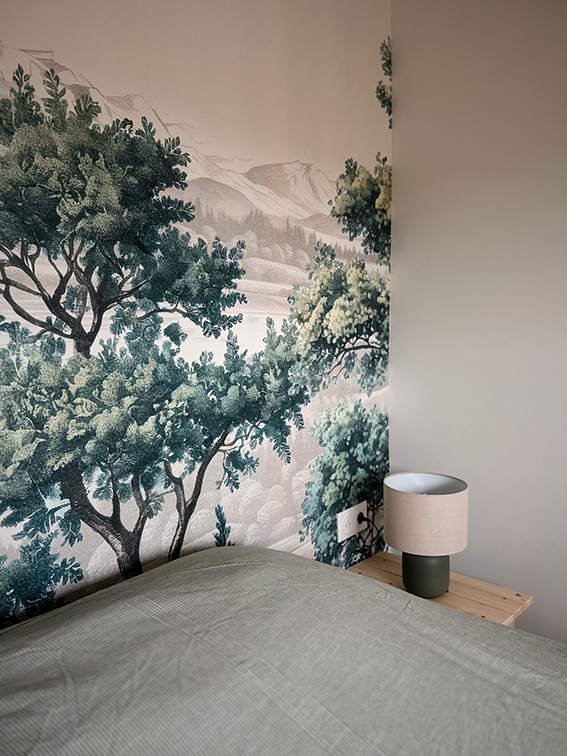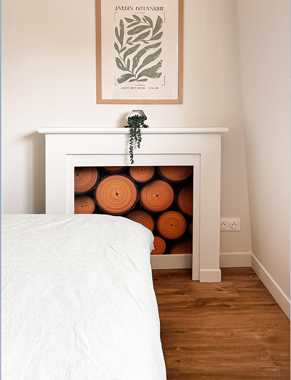 Voici quelques photos de la réalisation. Le panoramique tient toutes ses promesses et plonge vraiment la pièce dans une ambiance forestière. Mon client a même pris l’initiative de tapisser l’intérieur de la cheminée, de peur qu’un locataire ait la drôle d’idée d’y allumer un feu ;-))) Le dressing réalisé avec des branches de bouleau donne immédiatement le ton : un espace naturel, apaisant et plein de charme.