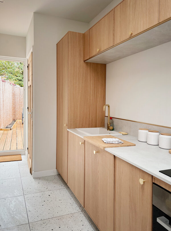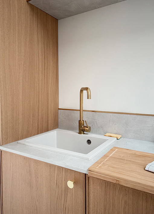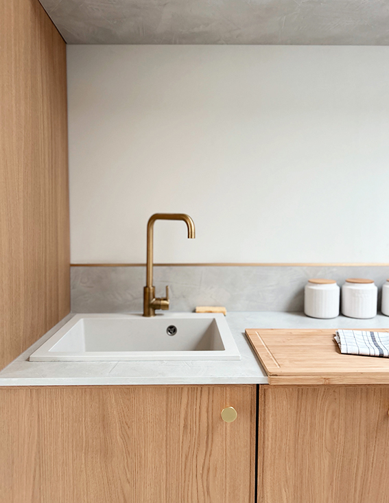 Pour la cuisine, nous avons opté pour un modèle tout en bois afin de réchauffer l’atmosphère et d’apporter une vraie sensation de confort. Elle vient elle aussi de chez Leroy Merlin, sous la référence Malmo. Pour renforcer le côté qualitatif et donner une touche plus raffinée, nous avons choisi une robinetterie et des boutons en laiton pour un détail chic qui fait toute la différence.