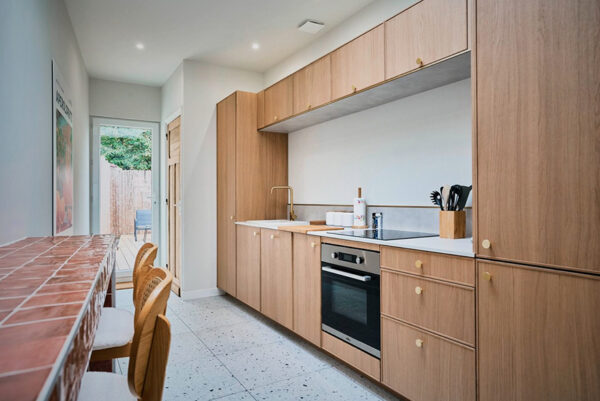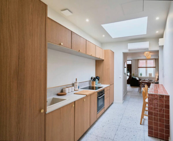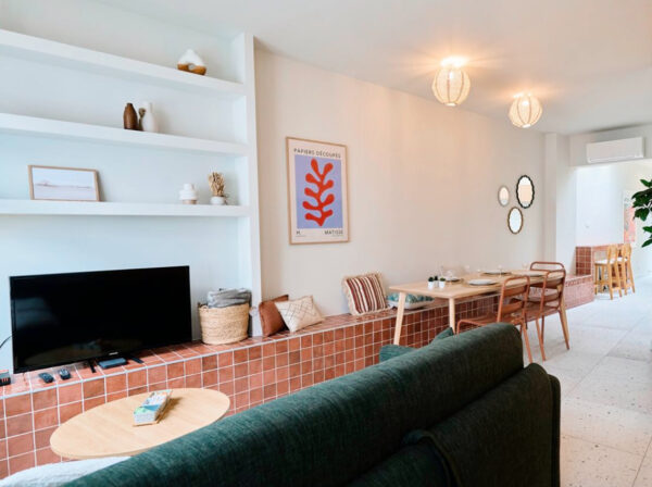 Je commence toujours mes projets par une réflexion sur l’aménagement de l’espace, avant même de parler couleurs ou décoration. Dans cette petite maison de rue, la circulation était un vrai défi : un couloir étroit grignotait une belle partie de la surface au sol. J’ai donc proposé à mon client de le supprimer afin de gagner en volume et en convivialité. Dès l’entrée, on arrive désormais directement dans le salon, un espace chaleureux et accueillant qui donne le ton de la visite. Le salon communique naturellement avec la salle à manger, formant ainsi un grand espace de vie ouvert, parfait pour un logement destiné à l’accueil de voyageurs. En poursuivant la circulation, on découvre la cuisine, pensée comme un lieu de partage. J’y ai ajouté un bar pour le petit déjeuner, pratique et convivial, et j’ai suggéré de déplacer les WC dans le prolongement de la cuisine. Ce nouvel emplacement les rend plus discrets, tout en optimisant la distribution du rez-de-chaussée. Pour lier visuellement les trois espaces, j’ai imaginé un banc filant sur toute la longueur de la pièce. Cet élément sur mesure apporte à la fois du style et de la fonctionnalité : assises supplémentaires et fil conducteur esthétique. Une idée simple, mais qui donne à la pièce son caractère atypique et unique.