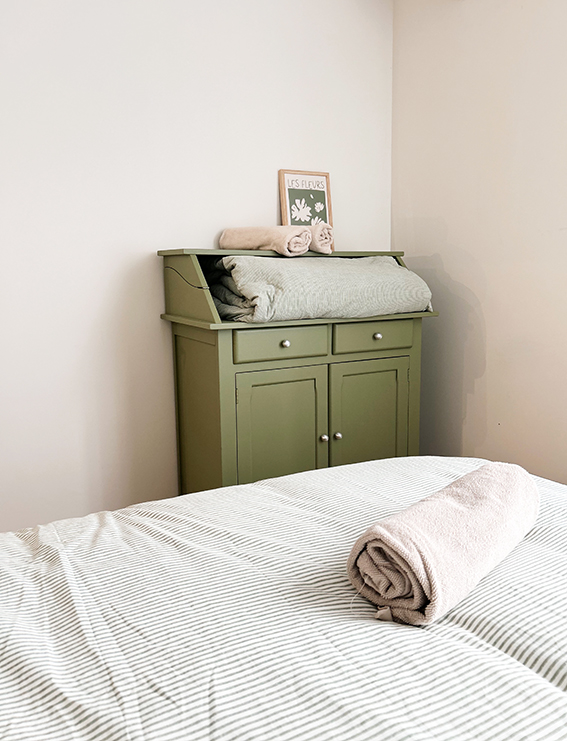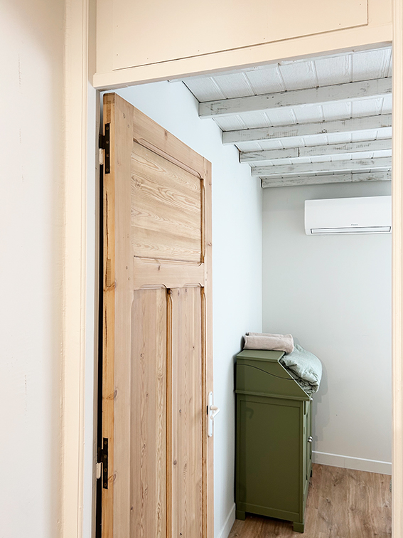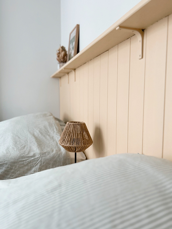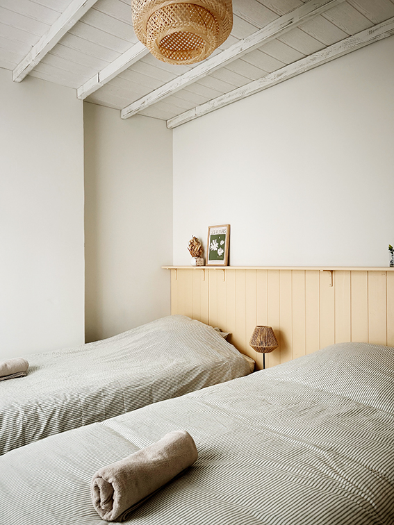 - un soubassement en bois peint en Jaune Tesselle de Liberon, qui sert également de tête de lit ;
