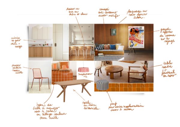 Pour insuffler un véritable esprit vacances sans tomber dans le cliché bord de mer, j’ai imaginé un style Riviera. Élégant, chaleureux et solaire. J’ai choisi une palette de couleurs enveloppantes : un orange doux pour la vitalité, un bleu marine profond pour l’élégance, et un vert sapin pour la touche nature. Ensemble, ces teintes créent une atmosphère apaisante et lumineuse à la fois. Pour réchauffer l’ensemble, j’ai intégré un mur en bois et quelques meubles aux matières naturelles. Ces éléments viennent contrebalancer la fraîcheur des zelliges et du sol en terrazzo. Afin d’aider mon client à se projeter, j’ai réalisé un moodboard rassemblant les matières, les teintes et les ambiances du futur espace.
